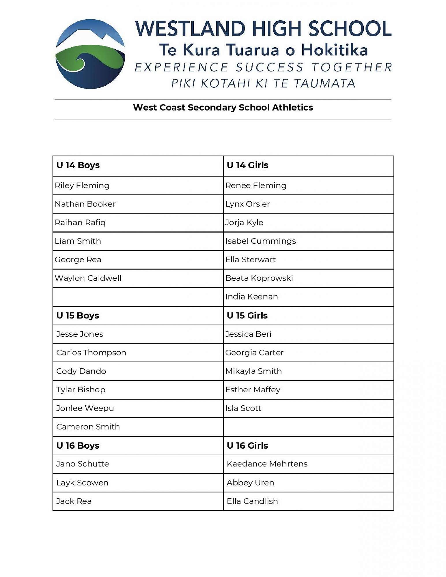 Congratulations to our students who made it through to represent us at the West Coast Secondary School (WCSS) athletics this week. Good luck, we wish you all the best.